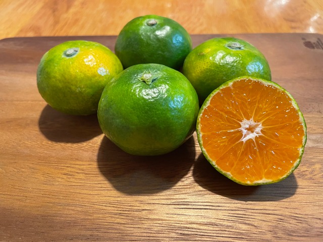 さっぱりとした甘みと 程よい酸味が特徴のみかんです。 まだ皮は青いですが、マルチ農法を使い 甘さをしっかりと引き出しています。 ※マルチ農法 反射シートを敷くことにより、太陽の光をたっぷり浴びせ 水分ストレス(土壌乾燥)を与え果実の糖度が上げる農法です。 三重県産